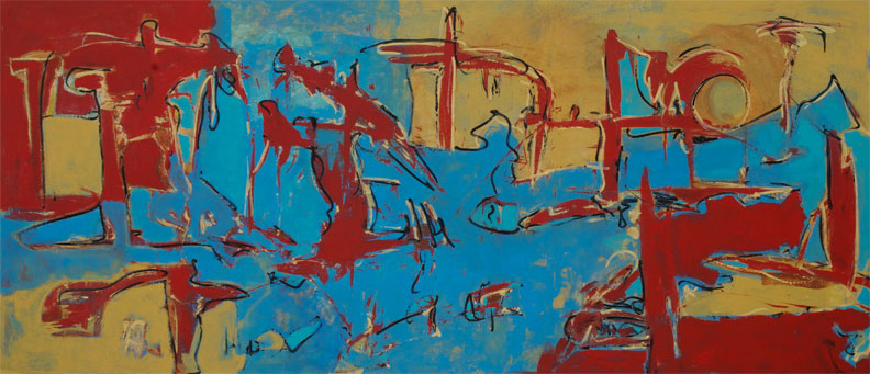 ![]() "Abstract-red-blue-gold" #215-5 h 65" x w 11' 9" Acrylic on canvas | ||